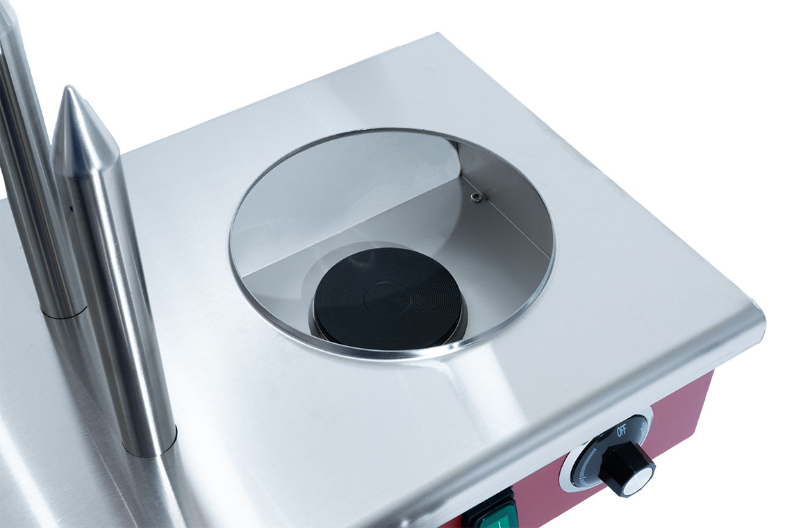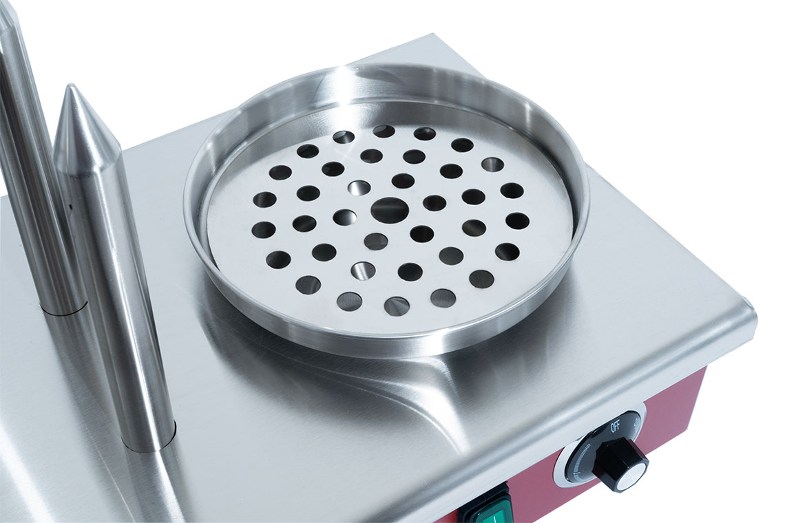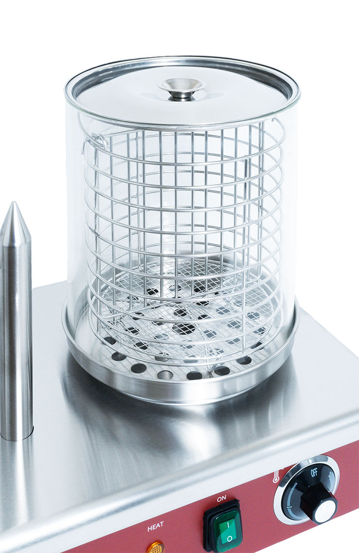 Professional hot dog cooker with steamer and 4 heating spikes. The whole device is made of stainless steel.